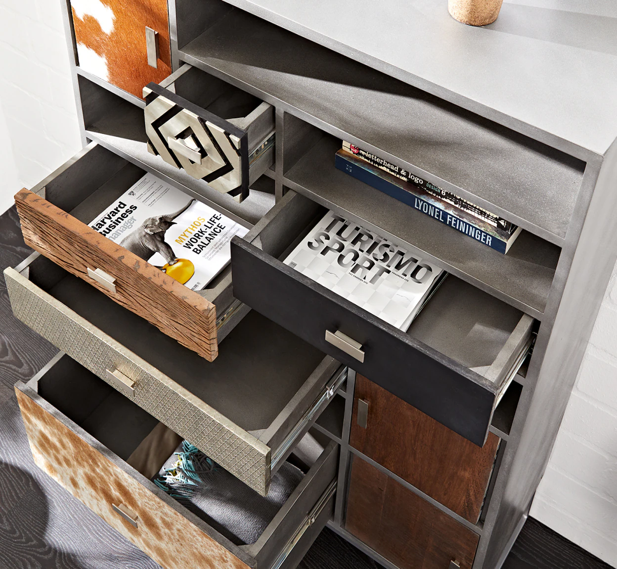 Hochkommode Highboard – mit dem modernen Multi Drawer Highboard kommt Schwung in den Wohnraum. Das Design des hochwertig verarbeiteten Möbelstücks begeistert mit einer geschmackvoll in Szene gesetzten Patchwork-Optik – facettenreich und inspirierend. Die einzelnen Frontelemente sind aus unterschiedlichen Materialien wie Ziegenfell und Metall-Furnier gefertigt. Auch recyceltes Massivholz von alten Bahnschwellen kommt hier zum Einsatz. Die unterschiedlichen, charaktervollen Oberflächen sind in galant aufeinander abgestimmten Farbnuancen gehalten – für eine natürliche, harmonisch anmutende Ausstrahlung.