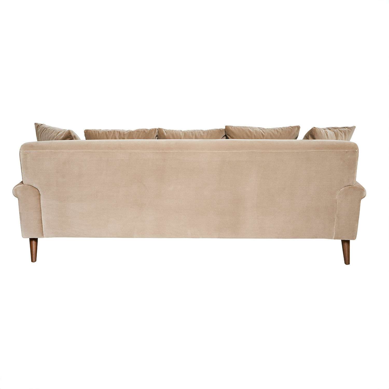 Die fünf inkludierten Zierkissen ergänzen den luxuriösen Sitzkomfort perfekt und verleihen dem Sofa eine einladende, gemütliche Note. Die sorgfältig gearbeiteten Holzfüße fügen einen Hauch von Eleganz hinzu und machen dieses Möbelstück zu einem Highlight in jedem Wohnzimmer.